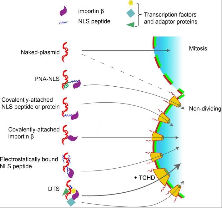 The common theme is that the DNA needs a nuclear localisation helper, which can be a Nuclear Localisation Signal (NLS, a specific sequence of amino acids in a protein in the cell) or a DNA transport sequence (DTS, discussed above in the SV40 section). By the way this only applies to cells that are not dividing. In cells that are dividing (undergoing mitosis) you don’t need any of these fancy mechanisms as shown in the graphic above – any free floating DNA will simply integrate.