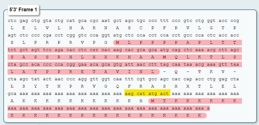 The tool tells us what will translate (in pink) and which requires a “M” (Methionine) to start any protein. The code for “M” here is ATG which is in that polyA tail sequence (but shouldn’t be).
