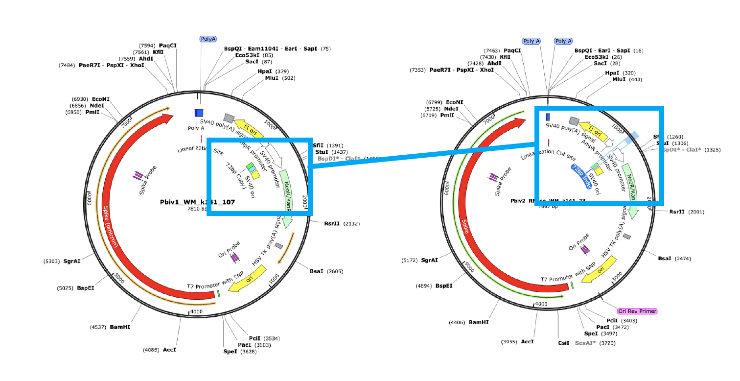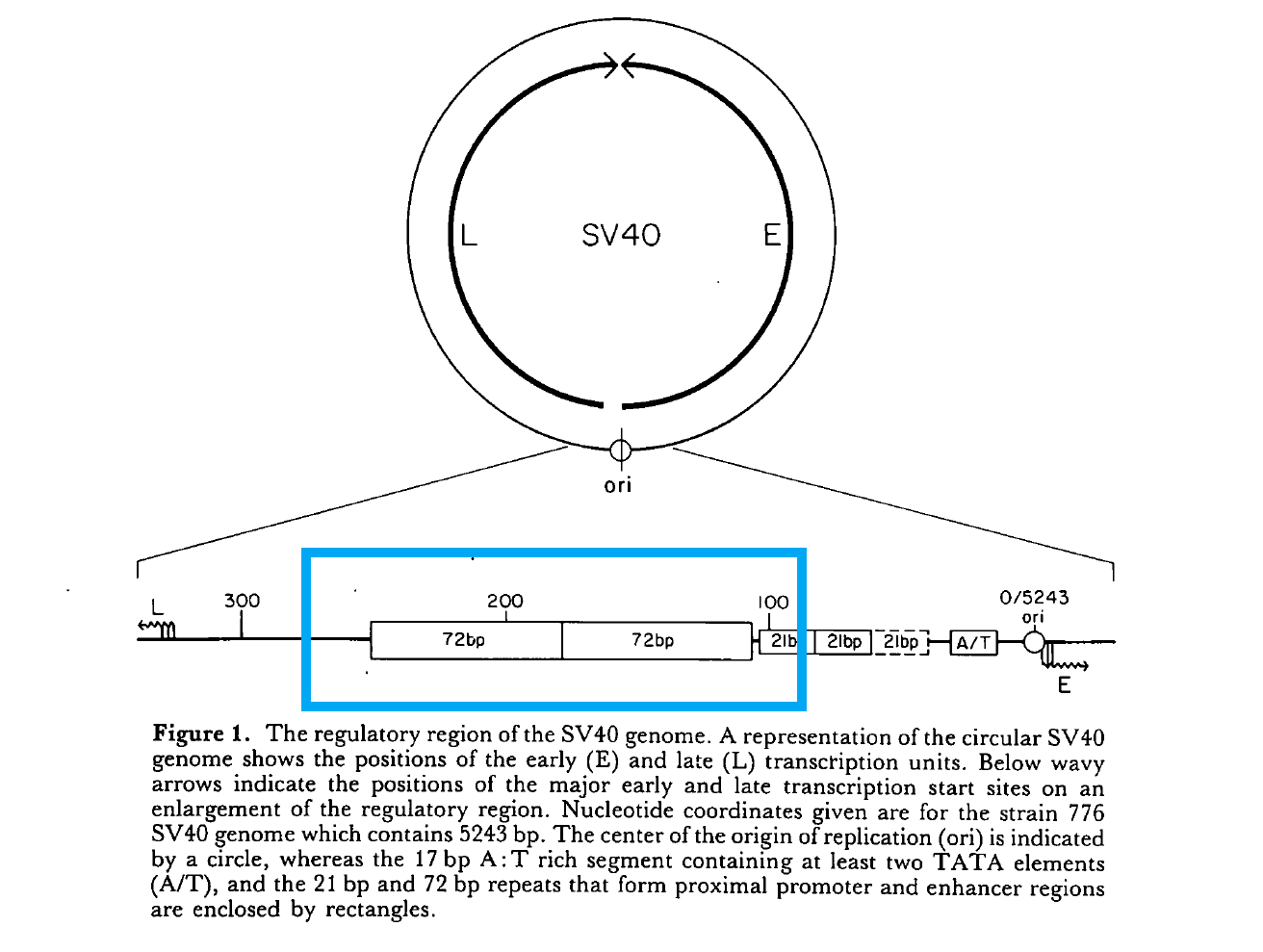 In the sequence map above you can see in the blue boxes (and pointed out by the authors) that there is one copy of a 72bp (base pair, or nucleotide pair) element in one version and two copies in another. This is 72bp element is directly from the SV40 genome and is seen in the enhancer of SV40 in either one of two copies3. It’s not a random 72bp sequence.