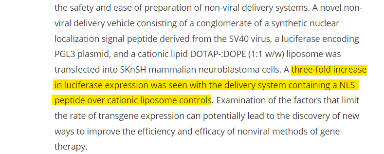 Which basically reiterates exactly what was being pointed out in the previous article, that is the combination of a liposome (transfectant agent) and a nuclear localisation signal (NLS) is a highly effective strategy if you wanted to get your DNA product into the nucleus of your cells.