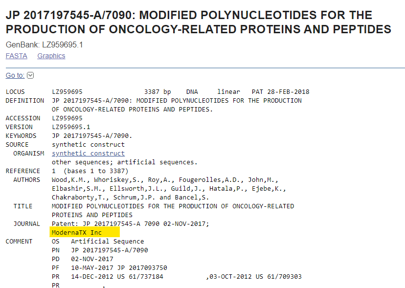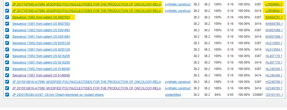Yes, that’s right. Every single one of these patents that contains that 19nt sequence (for which the probability of occurring by random chance is less than 1 in a billion) is from Moderna. [Note the sequence is actually the reverse complement sequence but this is likely a direct result of the cell lines that it occurred in – MSH3_mutated cell lines designed for developing cancer vaccines, the Moderna patent was actually for a mutated MSH3 gene for this purpose]