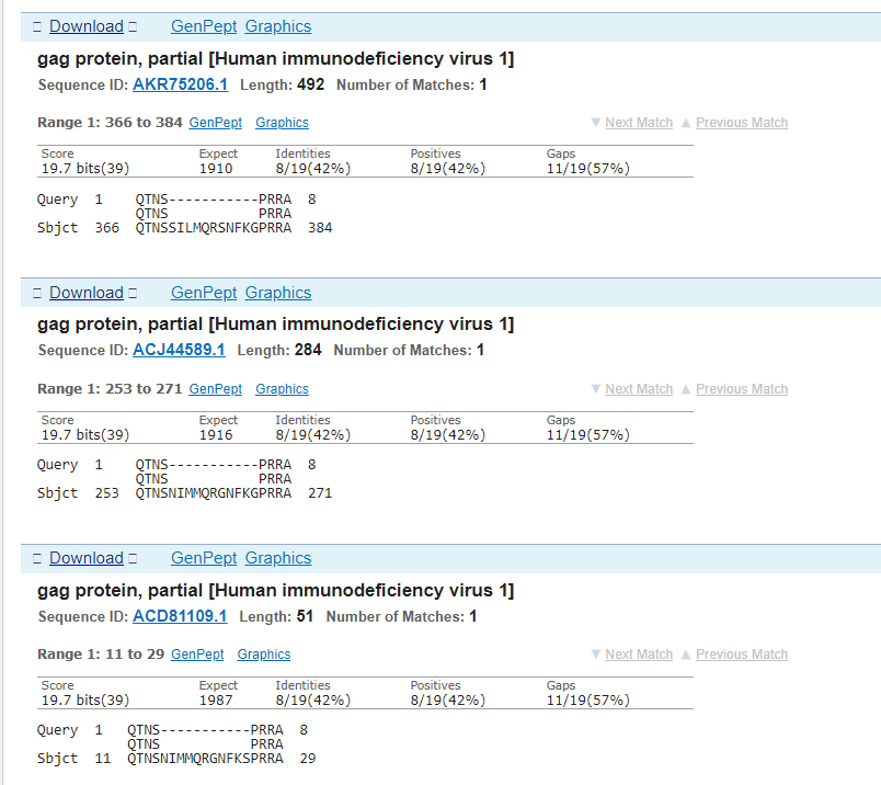 You can click on any of these and you will be taken to the alignment screen where the alignments between the subject (your TNGTKR) and query (all viruses) are shown, and you will see as you go down the page that the alignments only hold for HIV-1 until you start getting synthetic and hypothetical proteins, until the next real virus in the list which is HIV-2…