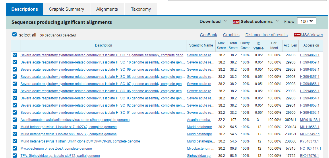 OK but one hit like this could be coincidental. In the list you will see the “E-value” which is an indicator of the probability of finding matches like this and should be as close to zero as possible. Here it’s 282 which really just reflects the likelihood of finding matches on a short sequence.
