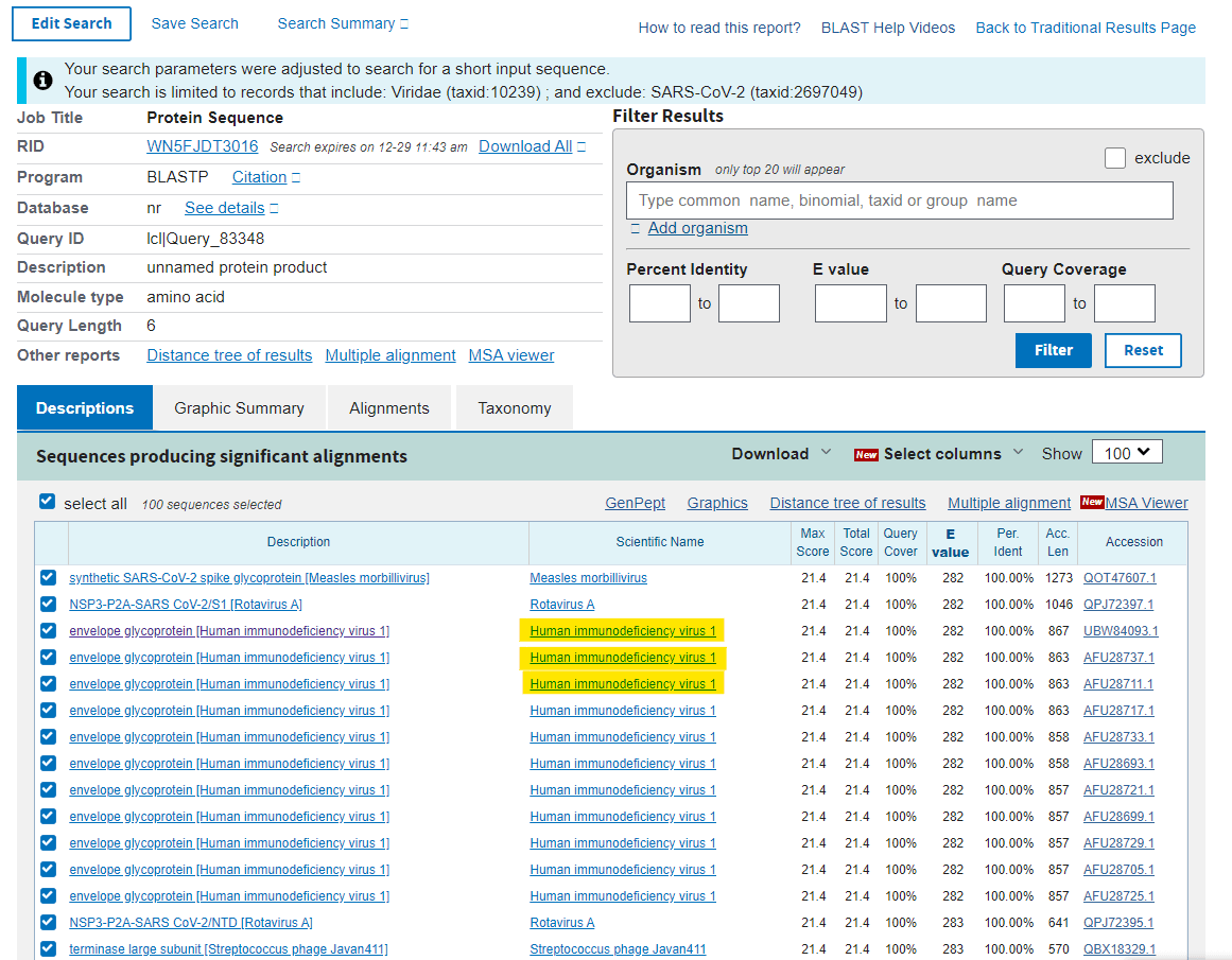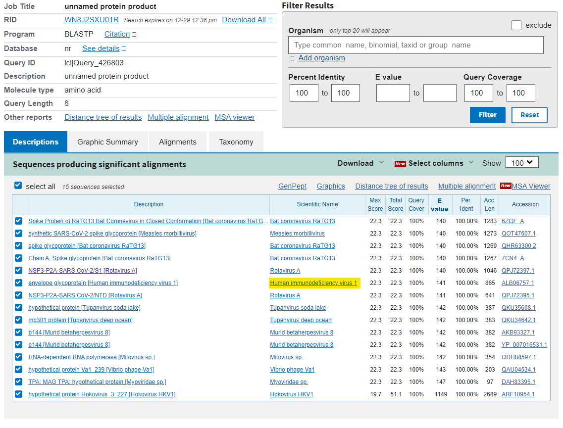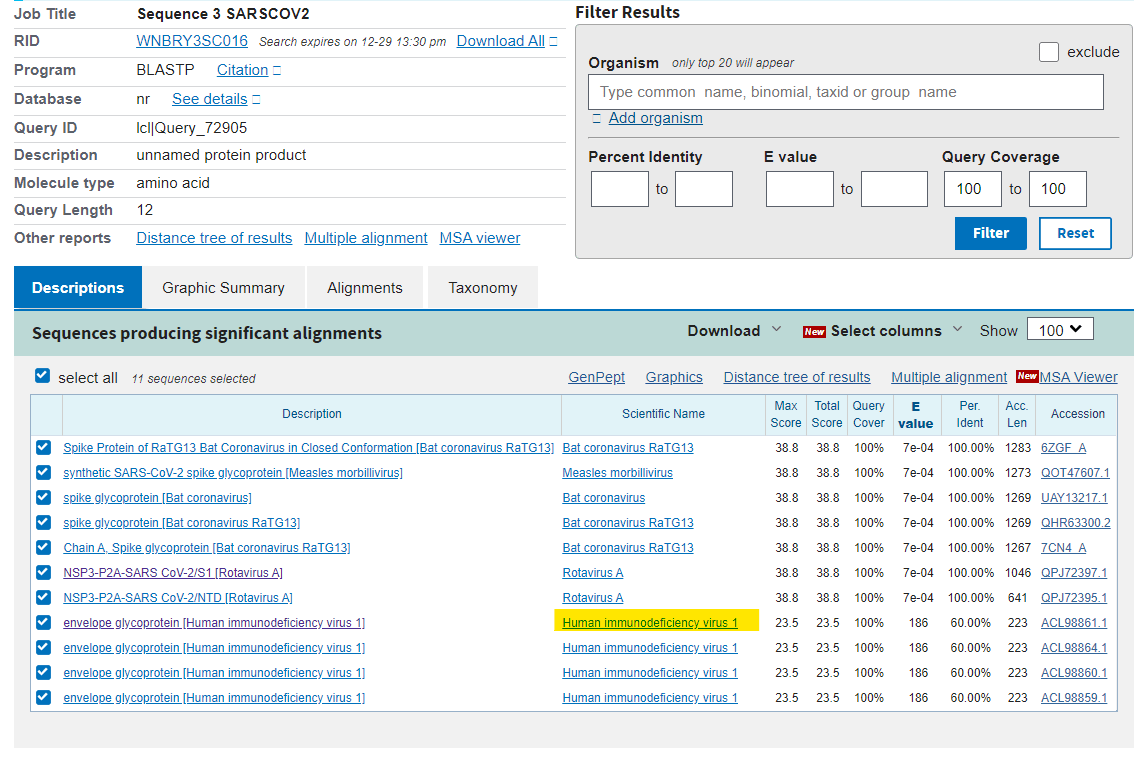 So in this search I have restricted the query coverage to 100% to get rid of the noise and the hypothetical proteins. All we are left with are the synthetic viruses from post-covid and RaTG13 (also post-covid). The only remaining virus in this list is, you guessed it, HIV-1. What are the odds that HIV-1 would pop up in all 3 searches?