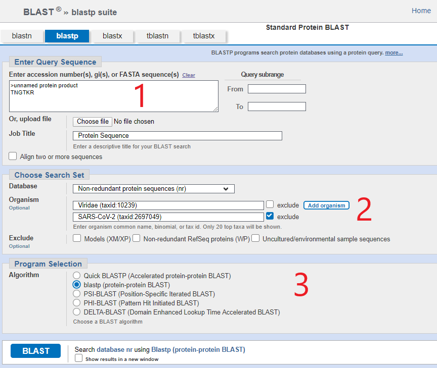 For step [2] in the BLASTp entry screen you need to add some filters. The first filter is to restrict the search to “viridae (viruses)” (or you can just enter 10239 which is the taxonomy ID). The reason for this is that there are gazillions of species on the planet and BLASTp will search for all of them, but you really only want to know which virus this motif came from. You’re not really interested if the motif is found in a squid, although it is possible that a squid also got in on the action with the famous bat-and-pangolin tete-a-tete touted by the likes of Peter Daszak and Dominic Dwyer, making it a zoonotic menagerie-a-trois, but let’s stick to reality.