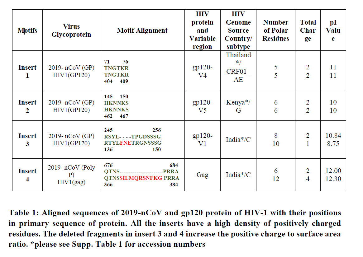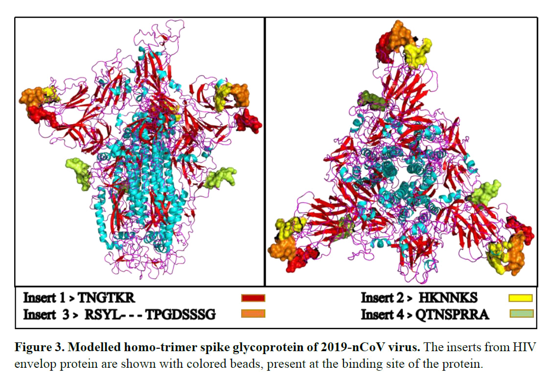 But look at this. These were not just random sequences from HIV. In his paper, Pradhan went further and recreated the structure of the virus with location of the four inserts. Lo and behold, these “random” inserts – all from HIV – are all at binding sites of the coronavirus. What are the odds?