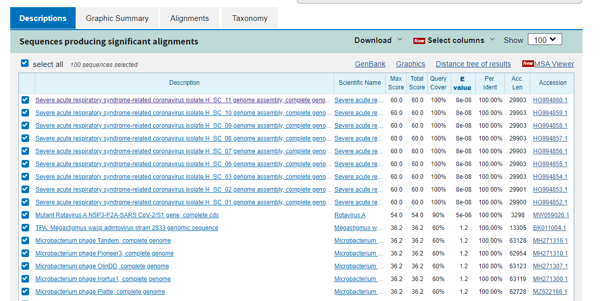 Once you’ve entered those hit the BLAST button and what do you get? You will get a list of candidates that have close homology to that sequence. Because it is a very short sequence the homology (likeness) should be 100%. The top of the page will be a summary of what you have requested and the rest of the page is a list of the matching sequences. What you will see immediately is near the top of the list are two synthetic viruses which are a chimaera of SARS-Cov-2 and another virus, which have appeared in the last 2 years by labs making more viruses (because we don’t have enough). The next in the list is a whole bunch of references to HIV-1.
