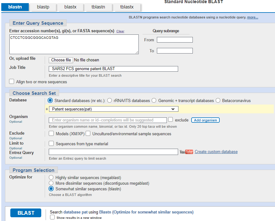 What you see is the same (misclassified SARS-CoV-2) sequences in the first 9 hits, and then none of the remaining hits have 19/19 matches. What this means is that there is no virus known to man that has this particular sequence in its genome prior to the discovery of SARS-Cov-2. So where on earth has it come from? For this you need to select a different database. Let’s go back to the BLASTn query screen and change the database option to “Patent sequences (pat)”. Remove all the exclusions and run the BLAST.