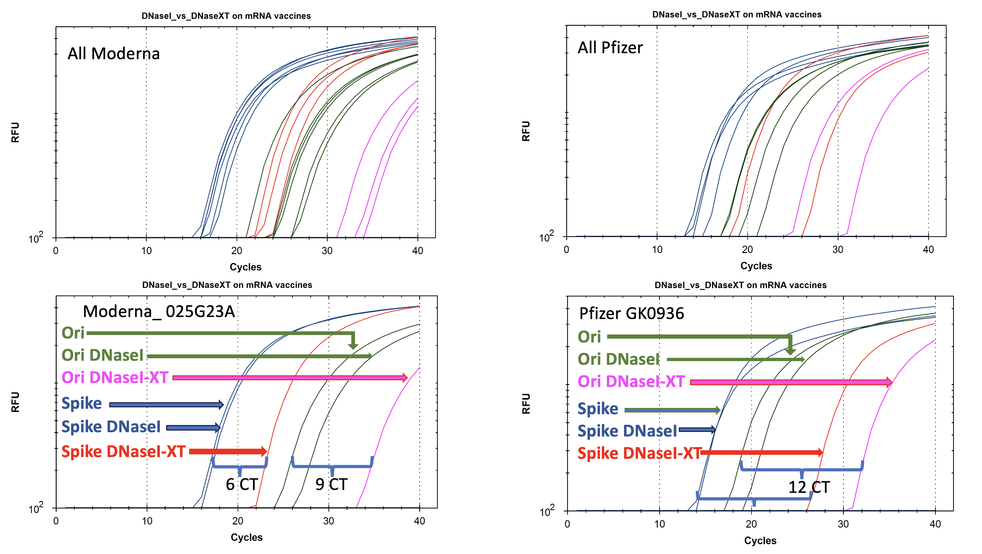 When DNaseI is applied to the Moderna vaccine the Spike signal in Blue doesn’t change. Only the Ori signal decays to a later CT.