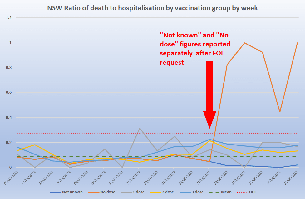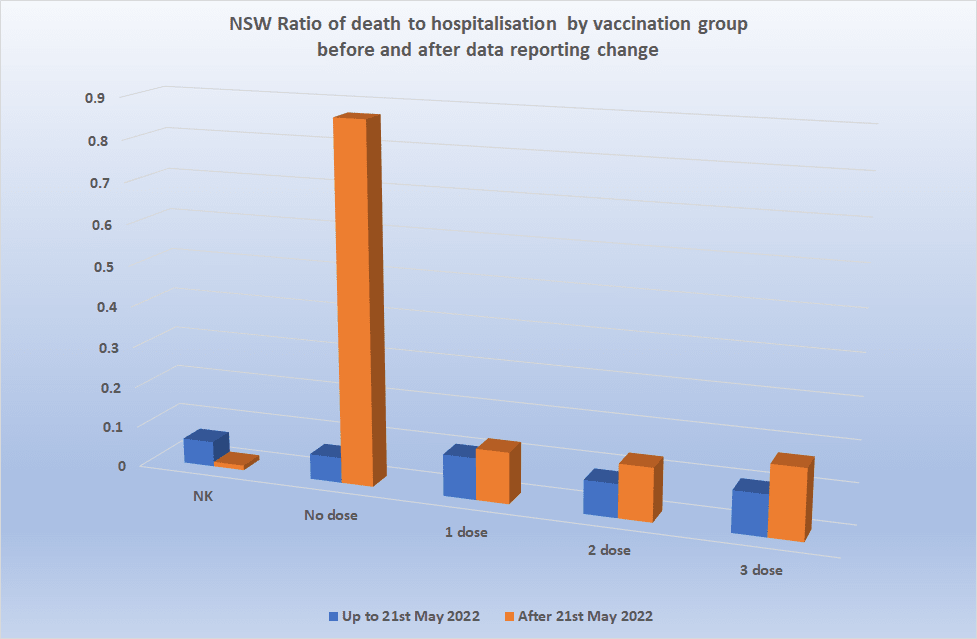 I know, it’s embarrassing. But it gets better. Eventually someone realised that combining the no dose and unknown groups was a fix and demanded – by FOI (please let me know if you have the link to this) – that NSW health provide the data by the actual number of doses received. And this is where the cover-up could be covered-up no more. This is what happened….