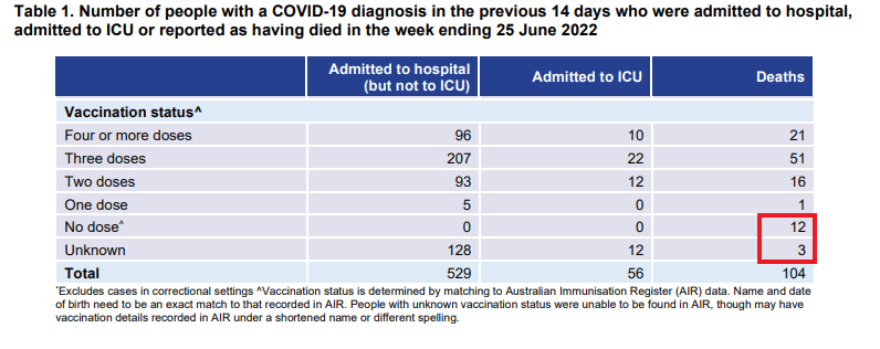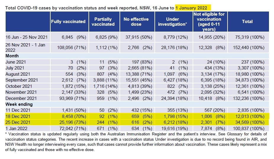 If you look carefully you will see that in the report up to 25th December (the middle graphic) pretty much all the “Under investigation” cases were shifted to the “No effective dose” group and this occurred after our friendly mice army on twitter had pointed out that by 18th Dec the unvaccinated were now accounting for only 6.7% (612/9144) of the total of known status cases. At the same time the case rate in the fully vaccinated had exploded jumping from 1428 to 8452 to 25114 week on week and the government’s bait and switch turned to “protecting you from going to ICU” . The more eagle eyed of you will note that the 7th January report (with the 25th December figures) was then quietly corrected by shifting the “unknown” cases back where they belonged, in the 13th January report (final graphic) by which time the switch away from “stopping infection” to “reducing the chance of severe COVID” was complete. Good play, NSW health.