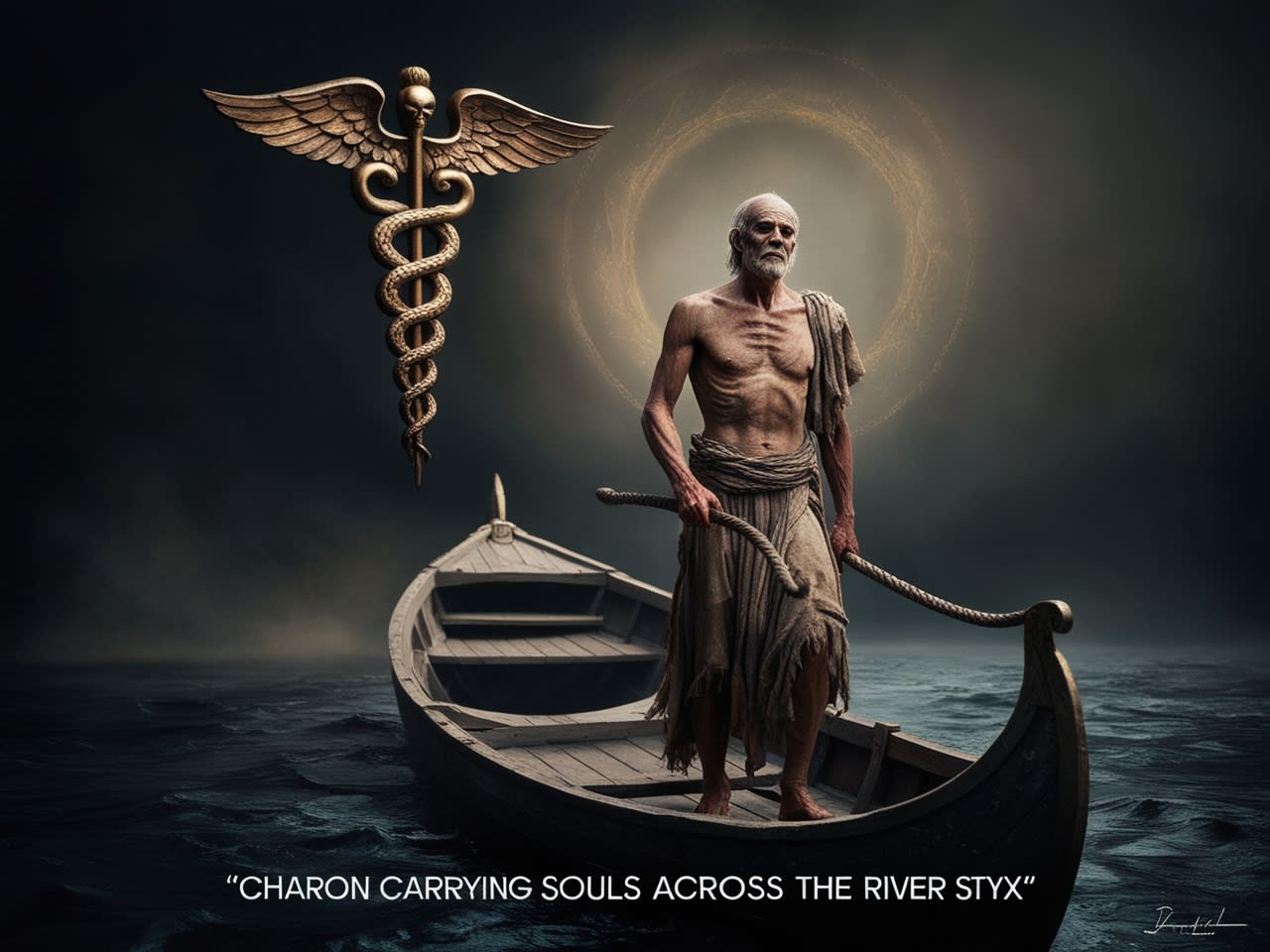 Followed by a suitably captioned version of the famous Litovchenko painting of Charon carrying souls across the river Styx as encountered in Greek mythology such as in Homer’s Odyssey.