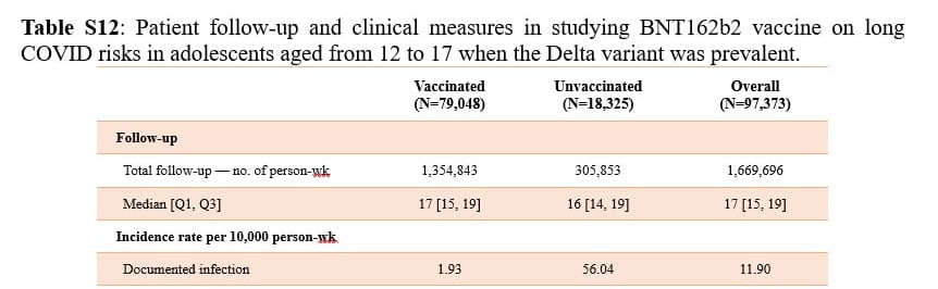 the study itself claimed that the reason that “long COVID” was prevented by the COVID vaccines is that the COVID vaccines had a 96% efficacy at preventing infection. Here’s their data.