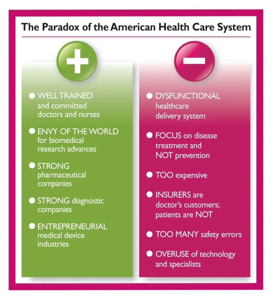 In sum, the paradox is that America has the providers, the science, the drugs, the diagnostics and the devices needed for outstanding patient care. But the delivery of care is dysfunctional at best and far too expensive. You are not getting the full potential of care that could and should be available and you are paying too much for what you do get.
