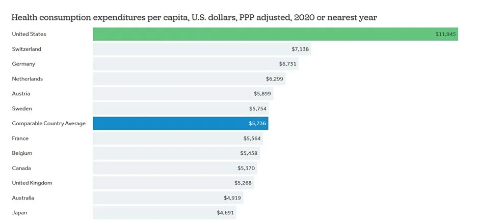 America spends nearly 20 percent of its Gross Domestic Product on medical care, which is double that of the average of 9.9% for the other 34 economically-developed countries (such as Canada, Britain, France, Germany and Japan) in the Organization for Economic Cooperation and Development. On a per capita basis, America spent ~$12,000 on health as of 2020, which is more than twice the average of the other countries and well above Switzerland, the second highest country in expenditures, at ~$7000.