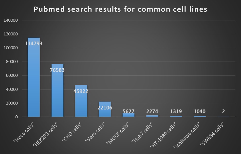 Just to illustrate this point I ran a Pubmed search for various different cell lines and their mentions. This is the result – only 2 papers on Pubmed with the search term “SW684 cells” and they are both written after that 1999 paper.