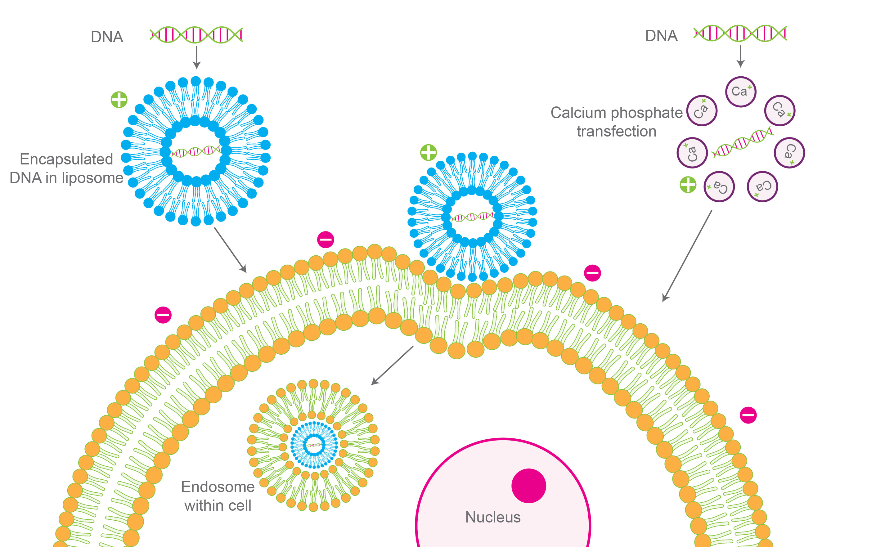 But they are not the only ones. You see, all you really need is the right circumstances and usually a positively charged particle (with an appropriate zeta potential) to carry your nucleic acid into your cell – because the inside of the cell that you want to get to is a relatively negative charge, and opposites attract.