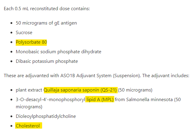 How about Shingrix, a recombinant zoster (shingles) vaccine? Surely that won’t have any products listed as “adjuvants” that could act as transfection agents? That would just be too coincidental… yet here we are: