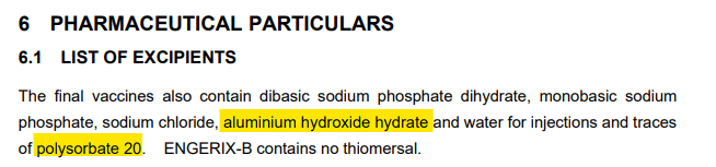 In a super bizarre coincidence, Engerix contains two chemical adjuvants that just happen to act as transfection agents – Aluminium Hydroxide and Polysorbate 20 (see below).